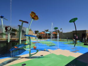 The result was the Oasis Splash Pad, a feature where water, light, and play meet in the heart of the desert. Designed as a dual-purpose attraction with aquatic elements from both Waterplay and Crystal Fountains, the splash pad captivates visitors both day and night. Offering families a refreshing escape from the desert heat through lively water effects and interactive elements during the day and transforms into a stage for colourful light shows and evening programming for special events at night.